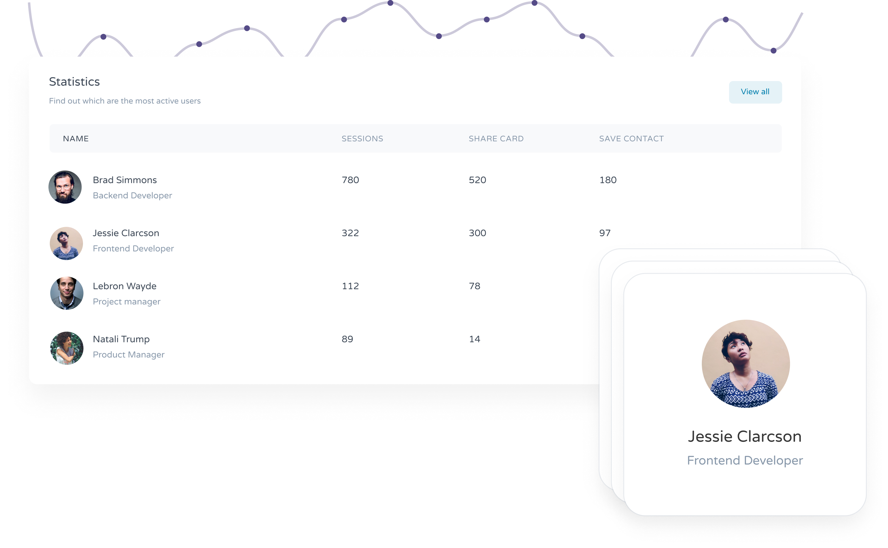 Customize and manage your team's cards from our dashboard. Discover usage insights with mycontact's report with traffic and number of clicks per link. Ready to stop wasting paper?